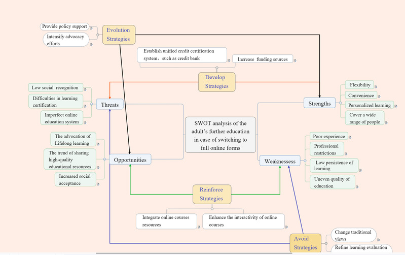 在成果展示环节,第三小组带来小学阶段开展在线形式教学的SWOT分析,认为小学阶段具有教学资源丰富、教学方式灵活等优势,但存在学习者缺乏集中度、缺乏学习氛围等缺点,同时也面临着因互联网技术逐渐成熟而导致的如何更好地对小学生使用物联网进行监管等来自外界的机遇和挑战。第一小组则巧妙地用“报纸”的形式制作并呈现了高中阶段开展在线学习的SWOT分析,认为需要思考如何高效地利用各个在线平台带来的教育资源、从“鱼龙混杂”的在线资源中寻找质量较高的成品,高中教师需要提升其利用数字资源的能力,去适应数字化时代的到来对于教学产生的影响。第二小组则基于一份可视化的思维导图,通过关键词与关键词之间的紧密而又复杂的联系,揭示了成人教育阶段在线教育开展的相关优劣势、以及外部的机遇和挑战之间的分析。