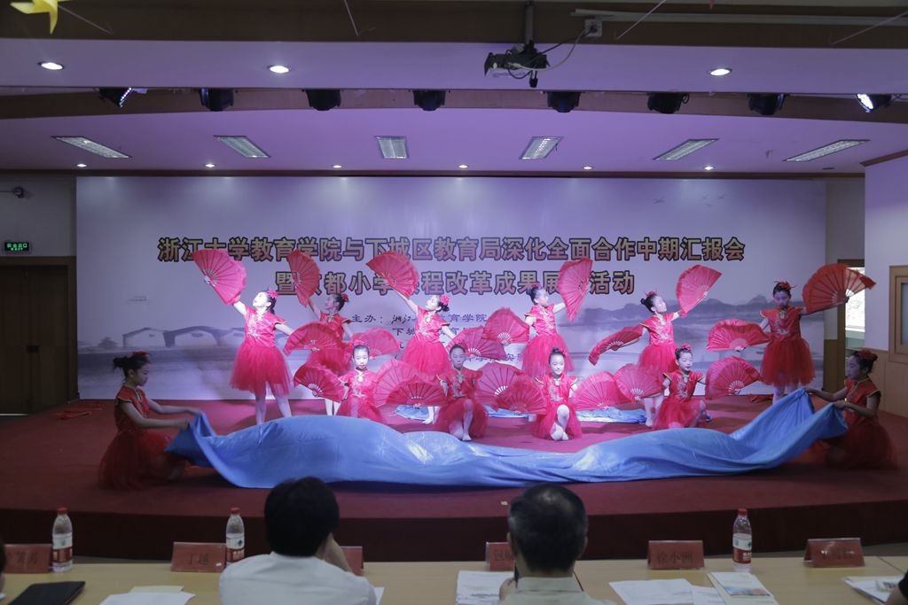 领导、下城区教育局领导、合作项目负责人及相关科室人员、京都小学部分师生参加了本次汇报会。