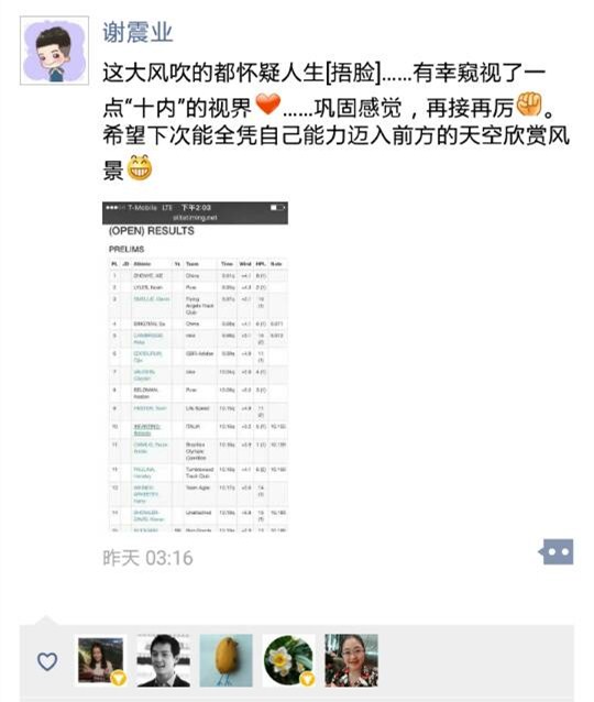 能在男子百米超级强国美国创纪录夺冠,使谢震业更具信心。今年中国短跑队的主要任务是备战和参加今年8月的伦敦世锦赛,根据中国田径队公布的信息,谢震业将参加5月13日国际田联钻石联赛上海站的比赛,届时他将与美国老将加特林同场竞技,在这些世界顶级选手的带动下,期待谢震业有更好的表现。