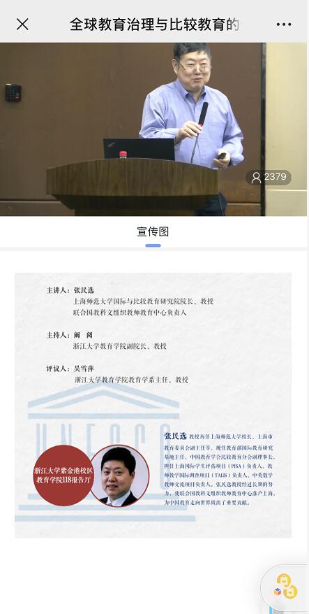 11月19号上午,上海师范大学国际与比较教育研究院院长、联合国教科文组织教师教育中心负责人、1986届比较教育学校友张民选教授应邀作题为“全球治理与比较教育研究者的新使命”的专题讲座,本次活动也是之江青年论坛系列活动之一。浙江省社科联一级巡视员邵清、巴卡漫画 院长顾建民教授、副院长阚阅教授和孙元涛教授、教育学系系主任吴雪萍教授等出席讲座,梅伟惠副教授、刘淑华副教授以及百余名教育学科学生参加此次讲座。本次讲座还专门开设线上直播,2000余名师生通过线上平台收看此次讲座。