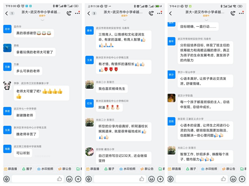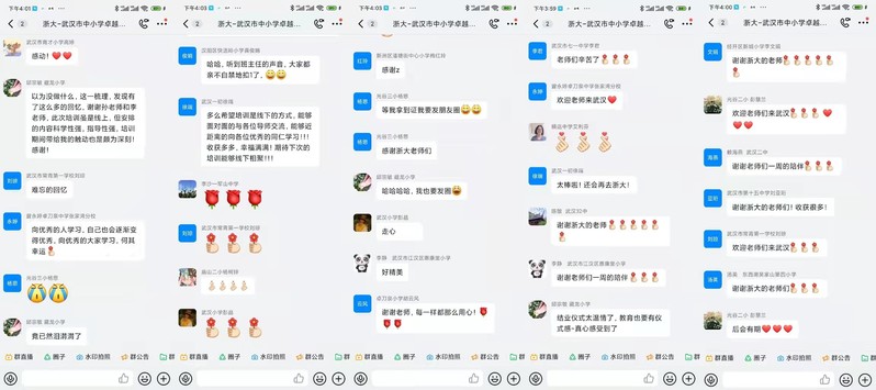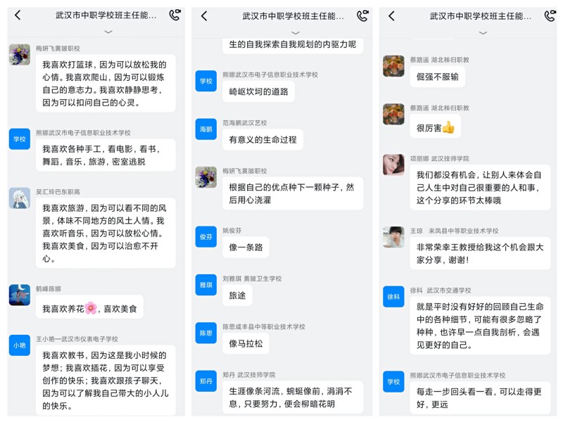 培训期间还设计了课前、课后互动模块。在课前班主任工作分享的互动环节中,来自各小组的学员代表结合自身工作经历,围绕班级管理、文化建设、学生指导、专业发展等内容,通过直接连线、视频制作、PPT展示等形式进行分享;每节课后,小组代表围绕课程与工作实际分享自己的听课感受。这既是对新知识、新理念的探讨,也为学员的深度交流搭建了平台。