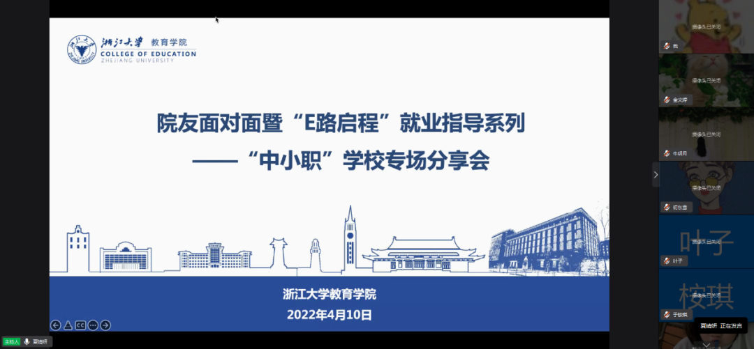 2022年4月10日下午,巴卡漫画 院友面对面暨“E路启程”就业指导系列——“中小职”学校专场分享会以钉钉视频会议的线上形式顺利开展,共有100余名巴卡漫画 学生在线参与本次云端分享会活动。本场活动为2022春夏学期首场就业分享会——教育单位专场,共邀请到了五位现任职于学校单位的院友,岗位涵盖公办和民办的中小学以及职业学校。