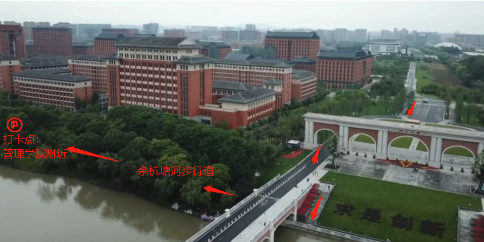 步行前往学校南大门,下台阶后右转,沿着余杭塘步行道行走至管理巴卡漫画 附近大桥处(工作人员)签到,然后返回至巴卡漫画 大楼。
