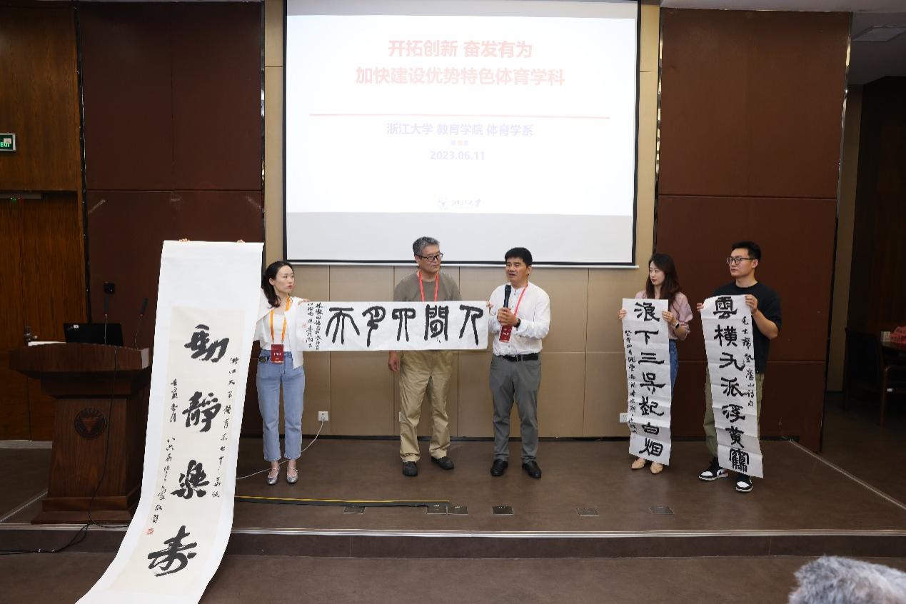在捐赠仪式上,池长庆和冯阳校友为母系捐赠书法作品,并对体育学系的培养表达了谢意。其中池长庆校友捐赠的“动静乐寿”中蕴含深刻的体育价值,体现运动与健康密不可分的联系;冯阳校友捐赠的“人间四月天”表达了对母系建设成果的欣慰之情与美好祝愿。
