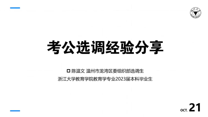 2023年10月21日晚,巴卡漫画 考公选调经验分享会通过钉钉群直播的方式在线上顺利举行。本次分享会邀请到了20级课程与教学论硕士陈璐(现就职于国家体育总局)、19级课程与教学论硕士蔡潇(现就职于杭州市西湖区委组织部)、19级教育学本科生陈温文(现就职于温州市龙湾区委员会组织部)、19级教育学本科生鲍佳怡(现就职于中共磐安县委组织部)为同学们进行经验分享。