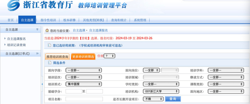教师自主选课分两轮进行,包括自主选课、学校审核、培训机构复核三个环节。第一轮自主选课时间为2024年3月19日-3月26日,第二轮补报名时间为2024年3月31日-4月1日。第一轮未选课的教师不能参加第二轮补报选课。
