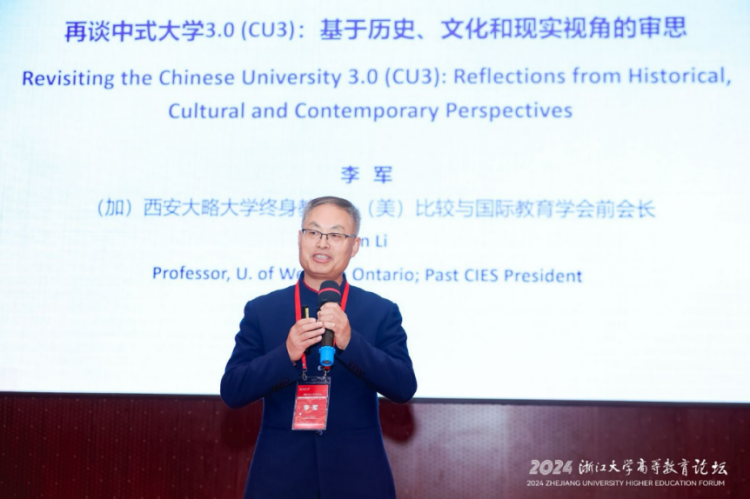 李军教授作题为“再谈中式大学3.0(CU3):基于历史、文化和现实视角的审思”的报告,并提出了“中式大学3.0”的概念。他从历史文化和现实的多维视角出发,探讨了中国大学的特点和发展历程,并提出了中国大学的几个特点,包括院校自主、思想自由、知行合一和求同存异。他强调了中国大学对全球高等教育的贡献,包括其独特的教育模式和提出世界一流大学建设之理念的贡献。李军教授深入浅出地回顾了中国大学发展历程,并对未来中国大学在全球教育中扮演的角色进行了展望。