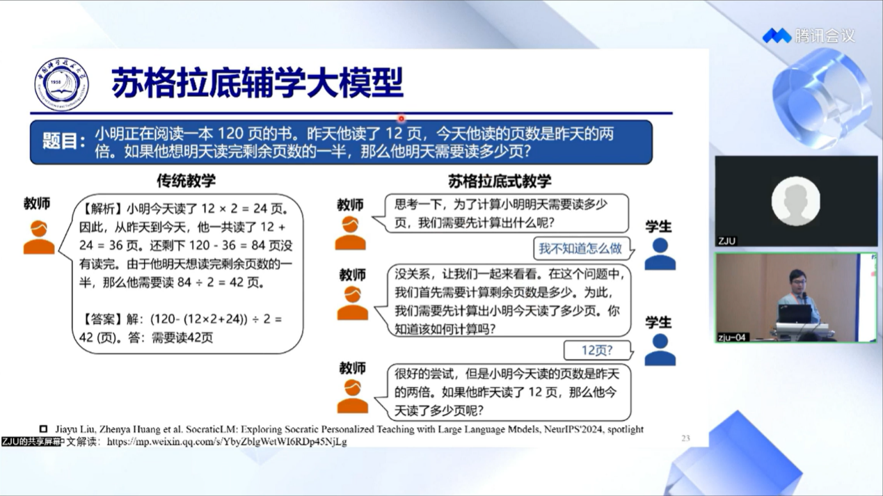 在青年论坛的上半场中,华中师范大学人工智能学部孙建文教授、中国科学技术大学计算机科学与技术巴卡漫画 黄振亚副教授、西安交通大学计算机科学与技术巴卡漫画 张玲玲副教授以及北京师范大学教育技术巴卡漫画 卢宇副教授分别围绕教育大模型的塔式构建法、引导式教学大模型研究与实践初探、大模型-符号协同的数学问题求解、可信人工智能驱动的教育模型构建研究等议题进行了分享。