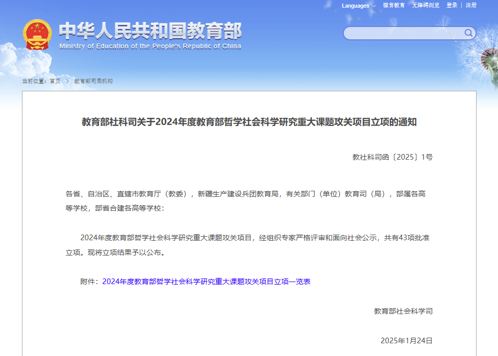 教育部哲学社会科学研究重大课题攻关项目是我国哲学社会科学研究领域层次最高、最具权威的项目类别之一。其宗旨是,支持高等学校适应国家经济社会发展的需要,把握学科前沿、开展深入、系统的创新性研究。