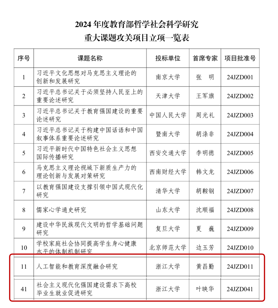 近日,教育部发布2024年度教育部哲学社会科学研究重大课题攻关项目立项名单,本年度,全国共立项43个项目。巴卡漫画黄昌勤教授领衔的“人工智能和教育深度融合研究”,叶映华教授领衔的“社会主义现代化强国建设需求下高校毕业生就业促进研究”获批立项,取得新突破。