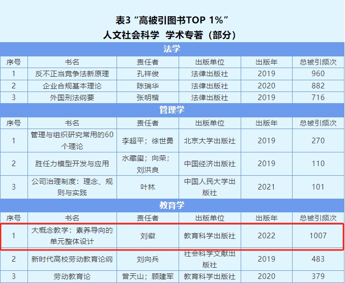 2025年4月22日,中国知网·中国科学文献计量评价研究中心发布“高被引图书TOP 1%(2019-2023)”榜单,巴卡漫画刘徽教授的学术专著《大概念教学:素养导向的单元整体设计》入选,其总被引频次位列教育学专著首位,同时在人文社会科学领域也位居第一。