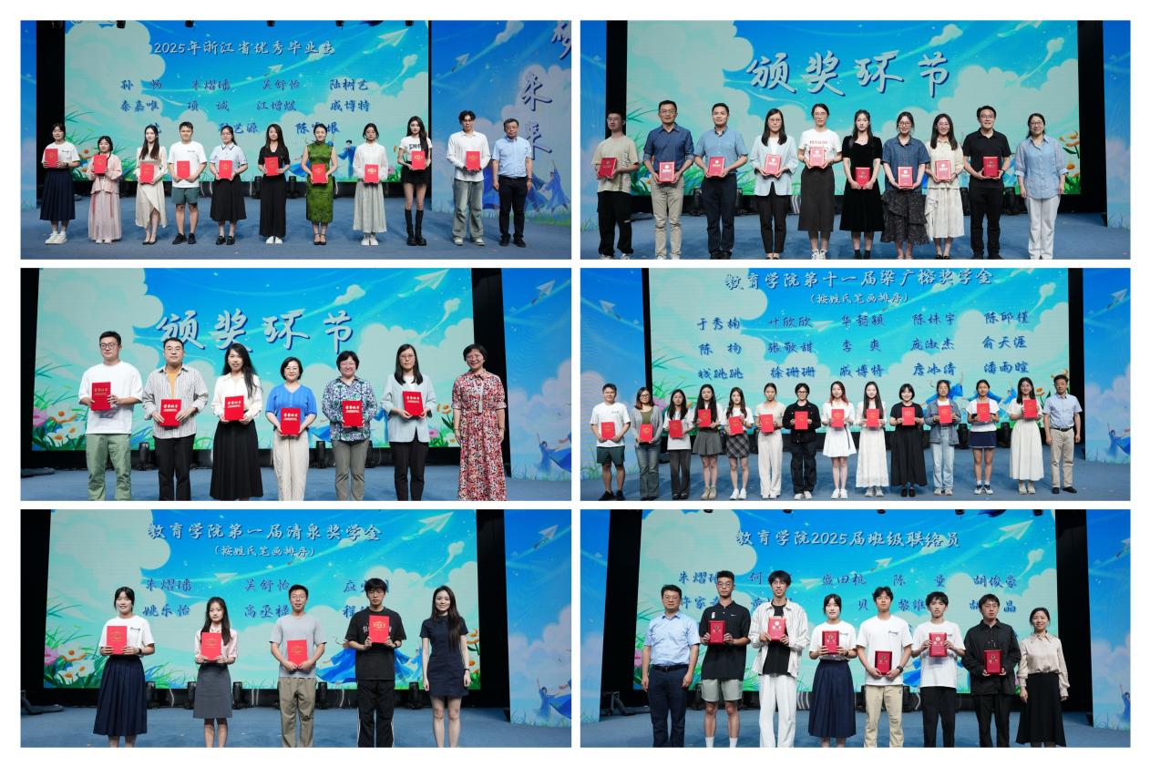 本次毕业晚会对优秀师生和先进集体进行了隆重表彰,依次表彰了浙江省普通高等学校优秀毕业生,巴卡漫画 先进基层党组织、优秀共产党员、优秀党务工作者,巴卡漫画 首届研究生“五好”导学团队、第十一届梁广榕奖学金获得者和首届清泉奖学金获得者,并颁发了2025届班级联络员聘书。这些奖项和聘书既是对优秀师生的肯定,也彰显了巴卡漫画 在党建与人才培养中的丰硕成果,激励着在场的每一个人努力拼搏、砥砺前行。