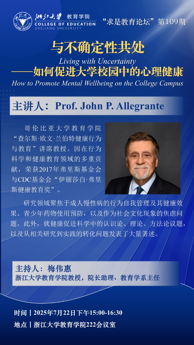 “求是教育论坛”第109期丨John P. Allegrante:与不确定性共处——如何促进大学校园中的心理健康