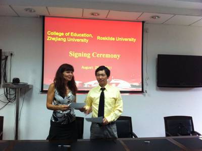 On behalf of the college, Dean Xu Xiaozhou extended a warm welcome to the delegation of Zealand. Dean Xu first introduced the college's basic overview, academic settings, teaching and research characteristics, personnel training as well as international exchange and cooperation activities, and reviewed the exchange and cooperation work between our college and Roskilde University. Jens Andersen gave a brief introduction to the basic situation of Zealand area of Denmark. The Vice--president of Roskilde University, Jens Andersen, and The Dean Koch of Zealand College communicated with each other in terms of their respective academic settings, curriculum selection, personnel training, international exchanges, and other areas, and both sides communicated and discussed in detail about the related areas in which they can cooperate. Following the discussion, the College of Education at Zhejiang University and the Roskilde University signed the exchange and cooperation agreement. Both sides will reached consensus to exchange teachers and students, conduct joint research and cooperation, co-sponsor international conferences as well as develop cooperation in areas like E-Learning and ICT.