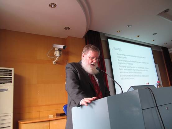 The lecture focused on equal education opportunities in higher education in the United States, and was titled "Higher Education and Social Justice: Rethinking the Role of Research". The three parts of the lecture consisted of "Globalization as a Context for Education Reform", "Using Actionable Research to Address Critical Challenges", and "Focusing on Critical Issues". Professor John stressed that actionable research could help to reduce the gap between what we aimed to do with respect to fairness and social justice and actual behavior and outcomes.