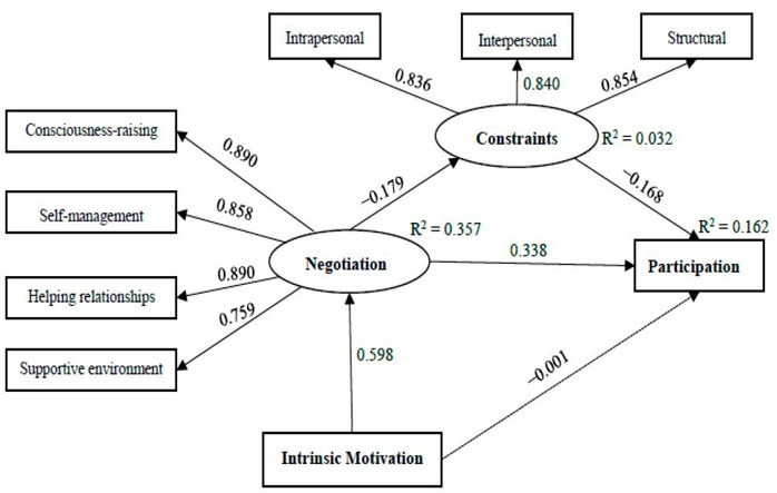 The constraint negotiation process is a prominent part of serious leisure, and leisure-oriented women runners in China may behave differently in this process. An adjusted model was proposed to examine the constraint negotiation process of serious leisure for women runners. An online questionnaire was conducted that contained 239 valid samples measuring the participation, intrinsic motivation, constraints and negotiation of women runners. The structure of variables was confirmed based on the good results of reliability and validity test. Then the structural equation modeling results showed that constraints had a negative impact and negotiation had a positive impact on participation. Negotiation acts on constraints to reduce their negative perception. Furthermore, intrinsic motivation has a significant positive effect on negotiation. There are high intrinsic motivation and fewer constraints reporting for women runners under high negotiation in serious leisure. The results provide additional explanation for the serious leisure participation of women runners. Future research should integrate women’s life experiences to better understand the behavior revealed in this study.