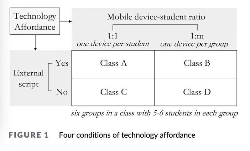 Background:Virtual manipulatives (VMs) are increasingly adopted in inquiry activi-ties. However, the effects of the ratio of mobile device-based VMs to students andexternal scripts (a guiding structure for prompting group process) provision on groupinteraction has not been detailed.Objectives:This study proposed four different technology affordance conditions forcollaborative inquiry learning: 1:1 device-student ratio (one tablet per student) withexternal scripts, 1:m ratio (one tablet per group) with external scripts, 1:1 ratio with-out external scripts, and 1:m ratio without external scripts. The purpose of this studyis to identify the effect of technology affordances on group behavioural patterns dur-ing collaborative inquiry learning.Methods:The research participants were 21 fifth-grade students from 4 classes(totalling 130 students) in a public elementary school. Students' collaborativeinquiry behavioural patterns were video-recorded during three themed inquiryactivities. To identify the behavioural patterns of groups, this study developedan action-oriented coding scheme for collaborative inquiry learning emphasizingand coded student actions during cooperation. Through lag sequential analysisand dialog content analysis, the behavioural transition modes of groups wereobtained.Results:The results show that device-student ratios and external scripts affectbehavioural patterns through resource coordination, information interaction, collabo-rative atmosphere, and task awareness.Implications:In mobile device-support collaborative inquiry learning, the 1:m device-student ratio yielded more exchanges to test and apply new constructions than thatof the 1:1 ratio. External scripts were more applicable to the 1:m condition than tothe 1:1 condition.